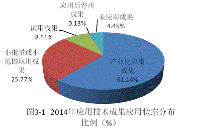 2014年度登記的46091項(xiàng)應(yīng)用技術(shù)科技成果中,產(chǎn)業(yè)化應(yīng)用的成果數(shù)達(dá)到28181項(xiàng),其中由企業(yè)完成的科技成果占56.89%;小批量或小范圍應(yīng)用成果數(shù)11877項(xiàng),其中由企業(yè)完成的科技成果占37.12%;試用成果數(shù)3922項(xiàng),大專院校占25.65%;應(yīng)用后停用成果數(shù)59項(xiàng),未應(yīng)用成果數(shù)2052項(xiàng),大專院校和獨(dú)立科研機(jī)構(gòu)在這兩項(xiàng)中所占的比例總計(jì)達(dá)到62.72%。