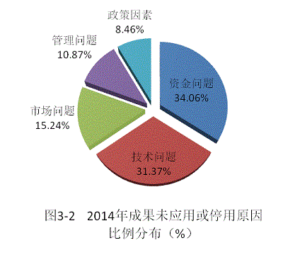 成果未應(yīng)用或停用的原因以資金問(wèn)題和技術(shù)問(wèn)題為主,同時(shí)受多種因素綜合影響。其中,資金問(wèn)題所占比例為34.06%;其次是技術(shù)問(wèn)題,所占比例為31.37%;市場(chǎng)問(wèn)題所占比例為15.24%;管理問(wèn)題和政策因素所占比例較低,分別為10.87%和8.46%(見(jiàn)圖3-2)。