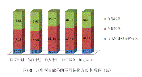 政府項(xiàng)目科技成果轉(zhuǎn)化的主要方式是自我轉(zhuǎn)化和合作轉(zhuǎn)化,所占比例二者之和接近或超過(guò)90%,其中,除部門計(jì)劃項(xiàng)目自我轉(zhuǎn)化與合作轉(zhuǎn)化所占比例相當(dāng)外,其它政府項(xiàng)目自我轉(zhuǎn)化比例超過(guò)合作轉(zhuǎn)化。技術(shù)轉(zhuǎn)讓與許可收入占比在6%-12%之間(見(jiàn)圖3-3)。
