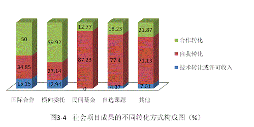 社會(huì)項(xiàng)目中民間基金、自選課題項(xiàng)目主要以自我轉(zhuǎn)化方式進(jìn)行轉(zhuǎn)化,所占比例分別為87.23%、77.4%。50%以上的橫向委托、國(guó)際合作項(xiàng)目以合作轉(zhuǎn)化方式進(jìn)行轉(zhuǎn)化。技術(shù)轉(zhuǎn)讓與許可收入方式轉(zhuǎn)化比例較低(見(jiàn)圖3-4)。