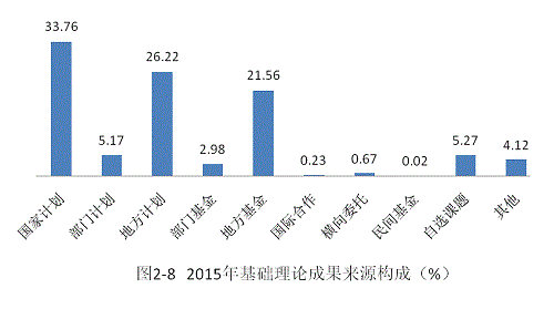 國(guó)家計(jì)劃項(xiàng)目仍是基礎(chǔ)理論成果的主要來(lái)源。從對(duì)各個(gè)地方和部門上報(bào)到國(guó)家科技成果庫(kù)的基礎(chǔ)理論成果數(shù)據(jù)的統(tǒng)計(jì)看,2015年基礎(chǔ)理論成果來(lái)源構(gòu)成中,國(guó)家計(jì)劃、地方計(jì)劃項(xiàng)目占59.98%,其中,國(guó)家科技計(jì)劃項(xiàng)目成果比例達(dá)到33.76%,與上年比例接近,地方科技計(jì)劃項(xiàng)目成果比例達(dá)到26.22%,比上年增長(zhǎng)7.86個(gè)百分點(diǎn)。地方項(xiàng)目(含地方計(jì)劃和地方基金項(xiàng)目)比例比上年增加2.42個(gè)百分點(diǎn),占47.78%;部門項(xiàng)目(含部門計(jì)劃和部門基金項(xiàng)目)所占比例比上年增加0.14個(gè)百分點(diǎn),為8.15%(見圖2-8)。