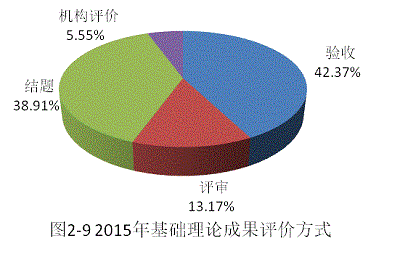 2015年基礎(chǔ)理論成果以驗(yàn)收、結(jié)題和評(píng)審為主要評(píng)價(jià)方式。對(duì)國(guó)家科技成果庫(kù)中2015年基礎(chǔ)理論成果數(shù)據(jù)進(jìn)行統(tǒng)計(jì),驗(yàn)收所占比例為42.37%,比上年增加5.86個(gè)百分點(diǎn);結(jié)題所占的比例為38.91%,比上年下降5.36個(gè)百分點(diǎn);評(píng)審所占比例為13.17%,比上年下降2.25個(gè)百分點(diǎn)(見圖2-9)。