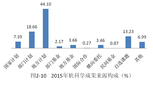 2015年,來(lái)自于地方登記的軟科學(xué)成果減少,來(lái)自于部門登記的軟科學(xué)成果數(shù)量基本保持不變。從對(duì)各個(gè)地方和部門上報(bào)到國(guó)家科技成果庫(kù)的軟科學(xué)成果的統(tǒng)計(jì)看,地方項(xiàng)目(地方計(jì)劃和地方基金項(xiàng)目)占47.76%,比上年增加1.74個(gè)百分點(diǎn);部門項(xiàng)目(部門計(jì)劃和部門基金項(xiàng)目)占20.83%,比上年下降1.33個(gè)百分點(diǎn);國(guó)家計(jì)劃項(xiàng)目占7.39%,比上年略有下降。國(guó)家計(jì)劃、部門計(jì)劃和地方計(jì)劃項(xiàng)目成果合計(jì)占軟科學(xué)成果總數(shù)的70.15%,與上年相比基本持平(見圖2-10)。