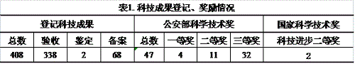 2014年度我部共登記科技成果408項,其中,應用技術成果288項,與2013年同比增長33%;軟科學成果117項,與2013年同比增長185%;基礎理論成果3項。我部評出公安部科學技術獎47項,其中,一等獎4項,二等獎11項,三等獎32項;榮獲國家科學技術進步獎2項。見表1。
