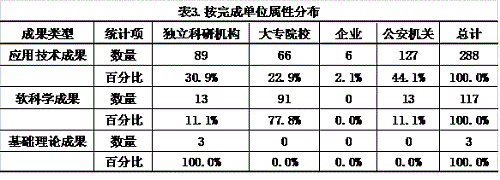 在應用技術成果中,公安機關成果127項,占44.1%,表明近半數(shù)應用技術科技成果由公安機關自己完成。在軟科學成果中,大專院校成果91項,占77.8%,表明大專院校為軟科學成果主要研究力量;基礎理論研究成果有3項,由獨立科研機構(gòu)完成。見表3。