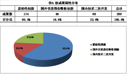 在應用技術成果中,“原始性創(chuàng)新”成果占成果總數(shù)的60.4%,“國外引進消化吸收創(chuàng)新”成果占16.0%,“國內(nèi)二次開發(fā)”占23.6%。見表4。