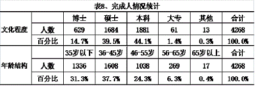 登記成果共涉及完成人4268人,按文化程度和年齡結(jié)構(gòu)分布情況見表8。
