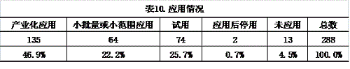 在288項應用技術類成果中,產(chǎn)業(yè)化應用成果135項,占成果總數(shù)的46.9%;小批量或小范圍應用成果64項,占22.2%;試用成果74項,占25.7%;停用和未應用成果15項,占5.2%。見表10。