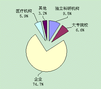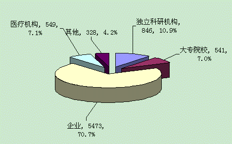 從項(xiàng)目承擔(dān)主體看,企業(yè)承擔(dān)的項(xiàng)目達(dá)到553項(xiàng),占項(xiàng)目總數(shù)的74.7%;獨(dú)立科研機(jī)構(gòu)70項(xiàng),占9.46%;大專院校49項(xiàng),占6.62%;醫(yī)療機(jī)構(gòu)44項(xiàng),占5.95%;其他24項(xiàng),占3.24%。