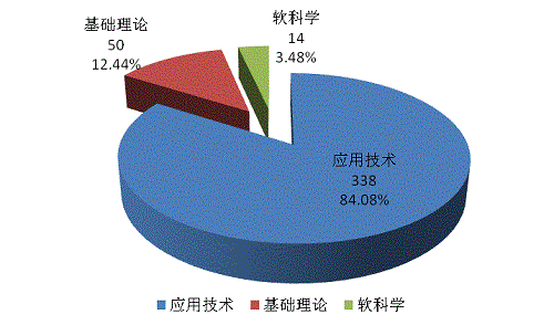 402項(xiàng)科技成果中,如下圖2所示,應(yīng)用技術(shù)成果338項(xiàng),占84.08%,較上年增長(zhǎng)6.17%;基礎(chǔ)理論成果50項(xiàng)(占12.44%),軟科學(xué)成果14項(xiàng)(占3.48%),后兩類成果較上年均略有下降。