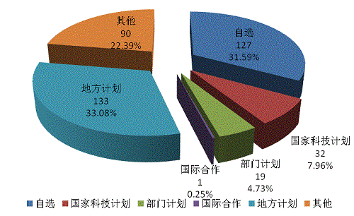 402項(xiàng)科技成果中,地方計(jì)劃仍為主要來(lái)源,達(dá)到133項(xiàng),占33.08%;自選項(xiàng)目127項(xiàng),占31.59%;國(guó)家科技計(jì)劃32項(xiàng)(科技支撐計(jì)劃7項(xiàng)、科技重大專項(xiàng)6項(xiàng)、自然科學(xué)基金6項(xiàng)、國(guó)際科技合作專項(xiàng)2項(xiàng)、科技型中小企業(yè)技術(shù)創(chuàng)新基金2項(xiàng)、科研院所技術(shù)開發(fā)研究專項(xiàng)資金2項(xiàng)、重點(diǎn)基礎(chǔ)研究發(fā)展計(jì)劃1項(xiàng)、星火計(jì)劃1項(xiàng)、火炬計(jì)劃1項(xiàng)、國(guó)家軟科學(xué)研究計(jì)劃1項(xiàng)、其他3項(xiàng)),占7.96%;部門計(jì)劃19項(xiàng),占4.73%;國(guó)際合作1項(xiàng),占0.25%;其他廳局計(jì)劃成果90項(xiàng),占22.39%。(見圖3)