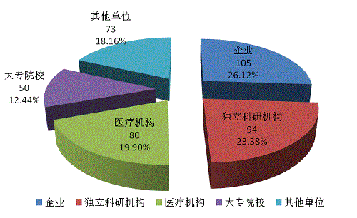 402項(xiàng)科技成果中,企業(yè)居成果完成主體的首位,達(dá)105項(xiàng)(其中科研轉(zhuǎn)制型企業(yè)完成10項(xiàng)),占26.12%,較上年增長(zhǎng)6%;獨(dú)立科研機(jī)構(gòu)完成94項(xiàng),占23.38%;醫(yī)療機(jī)構(gòu)完成80項(xiàng),占19.90%;大專院校完成50項(xiàng),占12.44%;其它單位完成73項(xiàng),占18.16%。(見圖4)