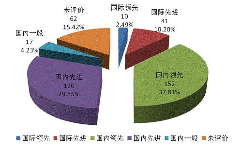 402項(xiàng)科技成果中,國(guó)內(nèi)領(lǐng)先及以上水平的共203項(xiàng),約占總數(shù)的一半。圖5可以看出,達(dá)到國(guó)際領(lǐng)先水平的成果10項(xiàng),占2.49%;達(dá)到國(guó)際先進(jìn)水平的成果41項(xiàng),占10.2%;達(dá)到國(guó)內(nèi)領(lǐng)先水平的成果152項(xiàng),占37.81%,達(dá)到國(guó)內(nèi)先進(jìn)水平的成果120項(xiàng),占29.85%;國(guó)內(nèi)一般水平的成果17項(xiàng),占4.23%;未評(píng)價(jià)水平(主要為行業(yè)準(zhǔn)入類成果)62項(xiàng),占15.42%。