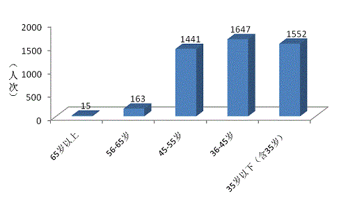 2.從年齡結(jié)構(gòu)來(lái)看,圖7表明,中青年是科技成果研究人員的主體。55歲以下的科研人員4640人次,占96.31%, 其中35歲以下的科研人員為1552人次,36-45歲之間的科研人員為1647人次,46-55歲之間的科研人員為1441人次,56歲以上科研人員為178人次,僅占3.69%。
