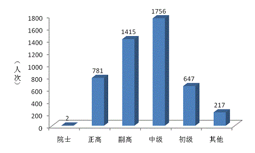 3.從技術(shù)職稱來(lái)看,圖8表明,具備中級(jí)以上技術(shù)職稱的科研人員為3954人次,達(dá)82.07%,占據(jù)了科研人員的主要比例,初級(jí)職稱者為647人次,占13.43%,其他科研人員217人次,僅占4.5%。