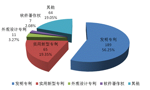 1.縱向看,從年度劃分,2014年度形成知識(shí)產(chǎn)權(quán)336件,數(shù)量快速增長(zhǎng),是2013年的2.8倍。知識(shí)產(chǎn)權(quán)結(jié)構(gòu)不斷優(yōu)化,發(fā)明專利達(dá)189項(xiàng),占知識(shí)產(chǎn)權(quán)數(shù)的56.25%,實(shí)用新型專利65項(xiàng),外觀設(shè)計(jì)專利11件,軟件著作權(quán)7項(xiàng),其他(發(fā)表SCI論文)64項(xiàng)。(見圖9)