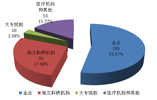 2.橫向看,從主體劃分,企業(yè)形成知識(shí)產(chǎn)權(quán)180件(占53.57%),是專利創(chuàng)造主力軍;獨(dú)立科研機(jī)構(gòu)93件(占27.68%);大專院校10件(占2.98%);醫(yī)療機(jī)構(gòu)和其他共有53件(占15.77%)。(見圖10)