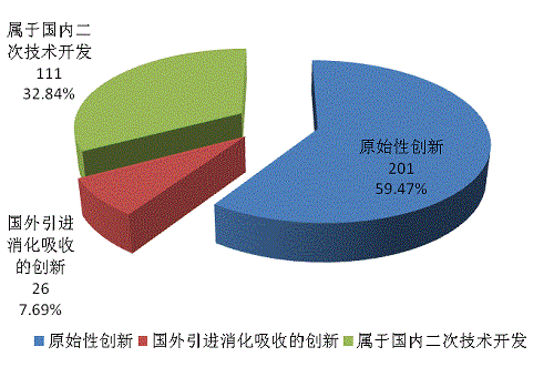338項(xiàng)應(yīng)用技術(shù)成果中,按照成果屬性占比從高到低排列依次為:屬于原始性創(chuàng)新的成果過(guò)半(占應(yīng)用技術(shù)成果數(shù)的59.47%),達(dá)到201項(xiàng);屬于國(guó)內(nèi)二次技術(shù)開發(fā)成果111項(xiàng),占32.84%;屬于國(guó)外引進(jìn)消化吸收的創(chuàng)新成果26項(xiàng),占7.69%。(見圖12)