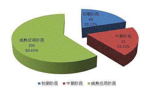 338項(xiàng)應(yīng)用技術(shù)成果中,如圖14所示,處于成熟應(yīng)用階段的成果205項(xiàng),占60.65%,初期階段成果68項(xiàng),中期階段成果65項(xiàng)。