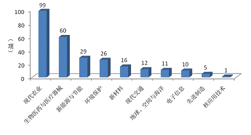 338項(xiàng)應(yīng)用技術(shù)成果中,有269項(xiàng)屬于高新技術(shù)領(lǐng)域,占應(yīng)用技術(shù)成果總數(shù)的79.59%。如圖15表明,269項(xiàng)成果分布在10個(gè)高新技術(shù)領(lǐng)域內(nèi),主要體現(xiàn)在四大高新技術(shù)領(lǐng)域,按照成果數(shù)由高到低排列依次是:現(xiàn)代農(nóng)業(yè)99項(xiàng)(占比36.8%)、生物醫(yī)藥與醫(yī)療器械60項(xiàng)(占22.3%)、新能源與節(jié)能29項(xiàng)(占10.78%)、環(huán)境保護(hù)26項(xiàng)(占9.67%),這四個(gè)領(lǐng)域成果占全部高新技術(shù)領(lǐng)域科技成果的79.55%。