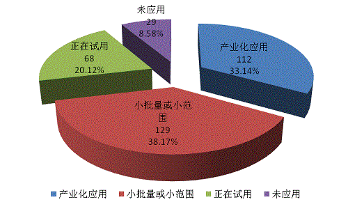 338項(xiàng)應(yīng)用技術(shù)成果中,產(chǎn)業(yè)化應(yīng)用成果112項(xiàng),占應(yīng)用技術(shù)成果總數(shù)的33.14%;小批量或小范圍成果129項(xiàng),占38.17%;正在試用的成果68項(xiàng),占20.12%,未應(yīng)用的成果29項(xiàng),占8.58%。(見圖16)