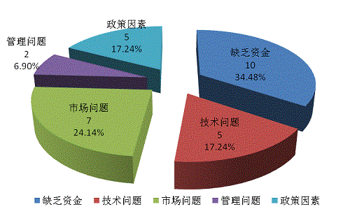 下圖17顯示,分析29項(xiàng)未應(yīng)用成果的原因得知,資金缺位仍是主要問(wèn)題,同時(shí)受到多種因素綜合影響。進(jìn)一步統(tǒng)計(jì)表明:由于缺乏資金造成未應(yīng)用10項(xiàng),占未應(yīng)用成果的34.48%;市場(chǎng)問(wèn)題造成未應(yīng)用的成果7項(xiàng),占24.14%;技術(shù)問(wèn)題造成未應(yīng)用的成果5項(xiàng),占17.24%;其次是由于政策因素、管理問(wèn)題造成未應(yīng)用的成果分別為5項(xiàng)、2項(xiàng),占比較低,分別為17.24%、6.9%。