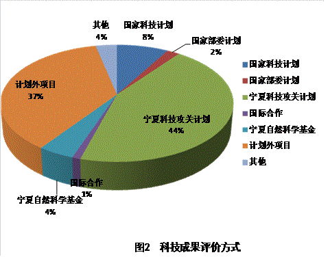 206項科技成果項目的評價方式中,由科技廳組織的科技計劃驗收93項;由寧夏科技成果管理中心組織的計劃外成果鑒定80項;評審19項;由自治區(qū)農(nóng)作物品種審定委員會審定的農(nóng)作物品種行業(yè)準入14項;(見圖3)。