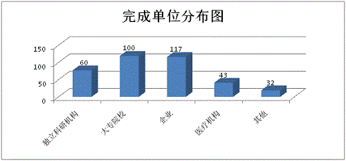 在352項(xiàng)登記成果中,按第一完成單位進(jìn)行統(tǒng)計(jì),獨(dú)立科研機(jī)構(gòu)完成的有60項(xiàng);大專院校完成的有100項(xiàng);企業(yè)完成的有117項(xiàng),醫(yī)療機(jī)構(gòu)完成的有43項(xiàng);其他32項(xiàng)。