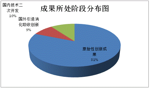 在307項(xiàng)應(yīng)用技術(shù)成果中,原始性創(chuàng)新成果246項(xiàng),占75.16%,國(guó)外引進(jìn)消化吸收創(chuàng)新23項(xiàng),占10.11%,國(guó)內(nèi)技術(shù)二次開發(fā)38項(xiàng),占14.74%。