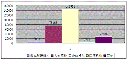 據(jù)統(tǒng)計(jì),2015年登記成果的經(jīng)費(fèi)實(shí)際投入額為259976萬元,大專院校投入75163萬元,企業(yè)投入144551萬元,獨(dú)立科研機(jī)構(gòu)投入為6894萬元,醫(yī)療機(jī)構(gòu)投入5522萬元,其他投入27846萬元。其中企業(yè)經(jīng)費(fèi)投入較大,獨(dú)立科研機(jī)構(gòu)及醫(yī)療機(jī)構(gòu)等單位經(jīng)費(fèi)投入較少。