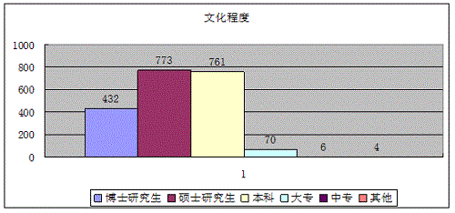 1、文化程度:按完成人員文化程度統(tǒng)計(jì):博士研究生432人,碩士研究生773人,大學(xué)本科生761人,大專70人,中專6人,其他學(xué)歷4人。上述數(shù)據(jù)顯示,成果完成人員學(xué)歷普遍較高。