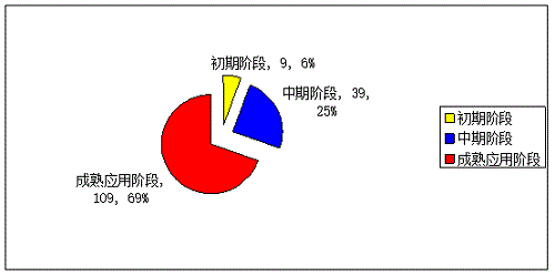 在登記的157項(xiàng)應(yīng)用技術(shù)成果中,處于初期階段的成果9項(xiàng)約占6%,中期階段的成果39項(xiàng)約占25%,成熟應(yīng)用階段的成果109項(xiàng)約占69%,從統(tǒng)計(jì)數(shù)據(jù)看,大多數(shù)項(xiàng)目都已處在成熟應(yīng)用階段。