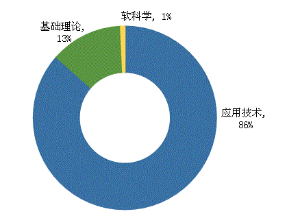 在2009年登記的科技成果中,應(yīng)用技術(shù)成果583項(xiàng),占86%;基礎(chǔ)理論成果86項(xiàng),占13%;軟科學(xué)成果5項(xiàng),占1%;應(yīng)用技術(shù)成果占主流。
