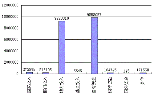經(jīng)統(tǒng)計(jì),2009年登記項(xiàng)目總經(jīng)費(fèi)實(shí)際投入額為19913360萬元,其中,國家投入273895萬元,占1%;部門投入218105萬元,占1%;地方投入9223310萬元,占46%;自有資金9858057萬元,占50%;自有資金與地方投入比例占主要部分。