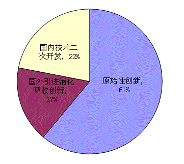 2009年江蘇省科技成果中原始性創(chuàng)新項(xiàng)目有356項(xiàng),占61%;國外引進(jìn)消化吸收創(chuàng)新項(xiàng)目99項(xiàng),占17%;國內(nèi)技術(shù)二次開發(fā)項(xiàng)目128項(xiàng),占22%。原始性創(chuàng)新項(xiàng)目占大多數(shù)。