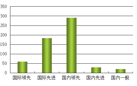 2009年江蘇省科技成果水平狀況,達(dá)國際領(lǐng)先項(xiàng)目有59項(xiàng),占10%;達(dá)國際先進(jìn)項(xiàng)目183項(xiàng),占31%;達(dá)國內(nèi)領(lǐng)先項(xiàng)目291項(xiàng),占50%;達(dá)國內(nèi)先進(jìn)項(xiàng)目29項(xiàng),占5%;達(dá)國內(nèi)一般項(xiàng)目21項(xiàng),占4%。其中,達(dá)國際先進(jìn)與國內(nèi)領(lǐng)先的項(xiàng)目占總數(shù)8成以上。