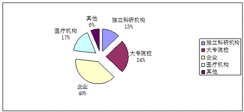 在登記的193項科技成果中,獨(dú)立科研機(jī)構(gòu)完成25項約占13%,大專院校完成47項約占24%,企業(yè)完成76項約占40%,醫(yī)療機(jī)構(gòu)完成33項約占17%,其他完成12項約占6%。數(shù)據(jù)表明,企業(yè)完成成果數(shù)量位列第一。