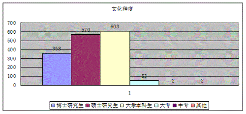 1、文化程度:按完成人員文化程度統(tǒng)計:博士研究生358人,碩士研究生570人,大學(xué)本科生603人,大專53人,中專2人,其他學(xué)歷2人。上述數(shù)據(jù)顯示,成果完成人員學(xué)歷普遍較高。