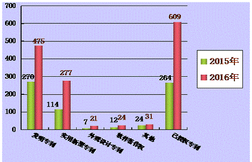 2016年全市登記的科技成果中知識(shí)產(chǎn)權(quán)數(shù)共828個(gè),其中發(fā)明專利數(shù)475個(gè),實(shí)用新型專利數(shù)277個(gè),外觀設(shè)計(jì)專利數(shù)21個(gè),軟件著作權(quán)數(shù)24個(gè),其他31個(gè),已授權(quán)專利數(shù)609個(gè)。與2015年登記的知識(shí)產(chǎn)權(quán)數(shù)相比,各項(xiàng)專利數(shù)均有大幅提升。(見圖4)