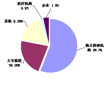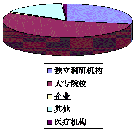 2.登記成果中,承擔(dān)項(xiàng)目單位性質(zhì)以大專(zhuān)院校和獨(dú)立科研機(jī)構(gòu)為主導(dǎo),企業(yè)和醫(yī)療機(jī)構(gòu)比例較少。149項(xiàng)科技成果中,大專(zhuān)院校和獨(dú)立科研機(jī)構(gòu)占總數(shù)的84.56%,企業(yè)和醫(yī)療機(jī)構(gòu)僅占3.36%。建議體育總局加大對(duì)相關(guān)企業(yè)和醫(yī)療機(jī)構(gòu)的資助力度,同時(shí),有能力開(kāi)展研究的企業(yè)和醫(yī)療機(jī)構(gòu)也要積極的申報(bào)相關(guān)項(xiàng)目。