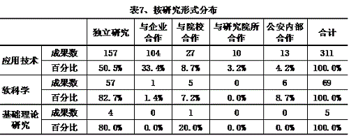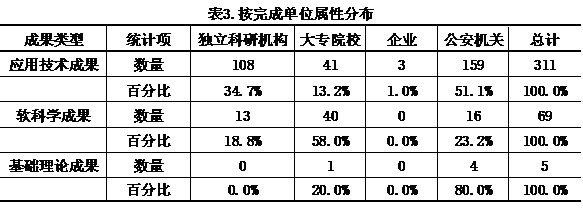 應(yīng)用技術(shù)成果以公安機(jī)關(guān)為主要研究力量,在311項(xiàng)應(yīng)用技術(shù)成果中,第一完成單位為公安機(jī)關(guān)的成果159項(xiàng),占51.1%。軟科學(xué)成果以大專(zhuān)院校為主要研究力量,在69項(xiàng)軟科學(xué)成果中,第一完成單位為大專(zhuān)院校的成果40項(xiàng),占58.0%;基礎(chǔ)理論研究成果僅有5項(xiàng)(見(jiàn)表3)。