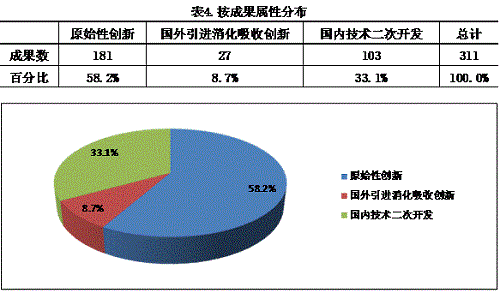 在311項(xiàng)應(yīng)用技術(shù)成果中,“原始性創(chuàng)新”成果占成果總數(shù)的58.2%,“國(guó)外引進(jìn)消化吸收創(chuàng)新”成果占8.7%,“國(guó)內(nèi)二次開(kāi)發(fā)”占33.1%(見(jiàn)表4)。