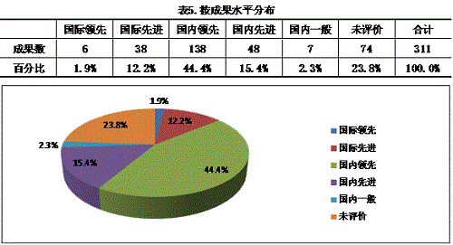 在311項(xiàng)應(yīng)用技術(shù)成果中,“國(guó)際領(lǐng)先”占1.9%,“國(guó)際先進(jìn)”占12.2%,“國(guó)內(nèi)領(lǐng)先”占44.4%,“國(guó)內(nèi)先進(jìn)”占15.4%,“未評(píng)價(jià)”占23.8%(見(jiàn)表5)。