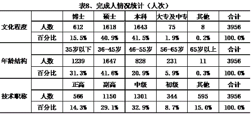 登記成果共涉及完成人3956人,按文化程度、年齡結(jié)構(gòu)和技術(shù)職稱(chēng)分布情況(見(jiàn)表8)。