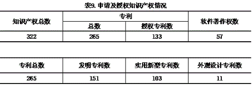 在311項(xiàng)應(yīng)用技術(shù)類(lèi)成果中,申請(qǐng)知識(shí)產(chǎn)權(quán)及獲得知識(shí)產(chǎn)權(quán)數(shù)量共322項(xiàng),其中,專(zhuān)利265項(xiàng),軟件著作權(quán)57項(xiàng)。在265項(xiàng)專(zhuān)利中,授權(quán)專(zhuān)利133項(xiàng)(見(jiàn)表9)。