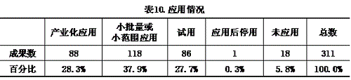 在311項(xiàng)應(yīng)用技術(shù)類(lèi)成果中,產(chǎn)業(yè)化應(yīng)用成果88項(xiàng),占成果總數(shù)的28.3%;小批量或小范圍應(yīng)用成果118項(xiàng),占37.9%;試用成果86項(xiàng),占27.7%;停用和未應(yīng)用成果19項(xiàng),占6.1%(見(jiàn)表10)。