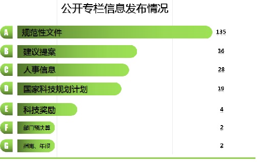 2.公開專欄發(fā)布情況。政府信息公開專欄完成了《科技部政府信息公開指南》修訂并發(fā)布,《2016年科技部政府信息公開工作年度報告》及時上網(wǎng),科技部2017年度部門預算、2016年度部門決算均上網(wǎng)公布,共主動發(fā)布信息226條。其中,規(guī)范性文件135條,占比59.73%;人大建議和政協(xié)提案復文36條,占比15.93%;國家科技規(guī)劃計劃19條,占比8.41%。