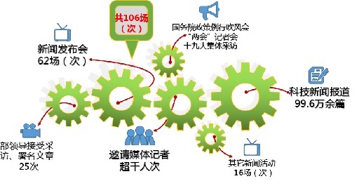 4.新聞發(fā)布會公開情況??萍疾抗才e辦新聞發(fā)布和專題宣傳活動106場(次),其中參加“兩會”記者會、十九大集體采訪、國務院政策例行吹風會各1次,舉辦新聞發(fā)布會62場(次),部領導接受采訪、或刊發(fā)署名文章25次、其他新聞發(fā)布活動16場(次),邀請媒體記者超過千人次。涉及科技部的科技新聞報道高達99.6萬余篇(條),為社會公眾深入了解科技工作提供了便捷渠道,為科技改革與創(chuàng)新提供了有力的輿論支撐。