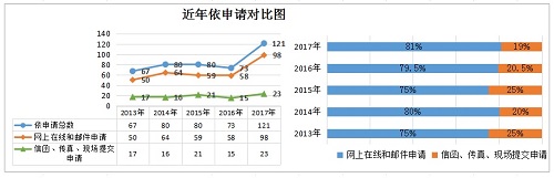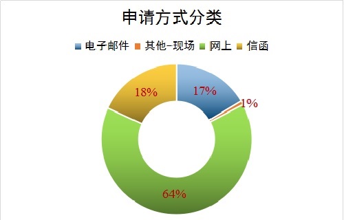 1.申請情況。2017年共收到依申請121件,超2016年50%,創(chuàng)歷年新高。按申請主體分類,公民依然是申請主力,申請113件,占93.39%,法人和其他組織申請8件,占6.61%。按申請方式分類,占比最大的是網(wǎng)上在線系統(tǒng),申請78件,占64%;信函和電子郵件占比相當,信函申請22件,占比18%;電子郵件申請20件,占比17%;另還有現(xiàn)場申請1件。按涉及業(yè)務分析,主要包括項目情況、政策文件、統(tǒng)計數(shù)據(jù)等,涉及科技部13個業(yè)務司局、事業(yè)單位。其中受公眾關注程度最高的三項分別是項目全過程管理相關情況、政策文件落實情況和各類經(jīng)費數(shù)據(jù)統(tǒng)計情況。