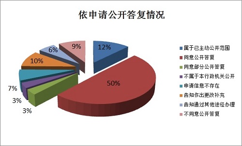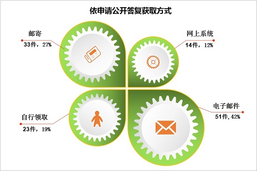2.答復情況。121件依申請已全部按規(guī)定辦結。按照答復內容分類,“已主動公開”的15件,占12%;“同意公開”的60件,占50%;“同意部分公開”的4件,占3%;“不同意公開”的11件,占9%;“不屬于本行政機關公開”的4件,占3%;“申請信息不存在”的8件,占7%;“告知作出更改補充”的12件,占10%;“告知通過其他途徑辦理”的7件,占6%。按答復獲取方式分類,電子郵件答復51件,郵寄答復33件,網(wǎng)上系統(tǒng)答復14件,上門自取23件。